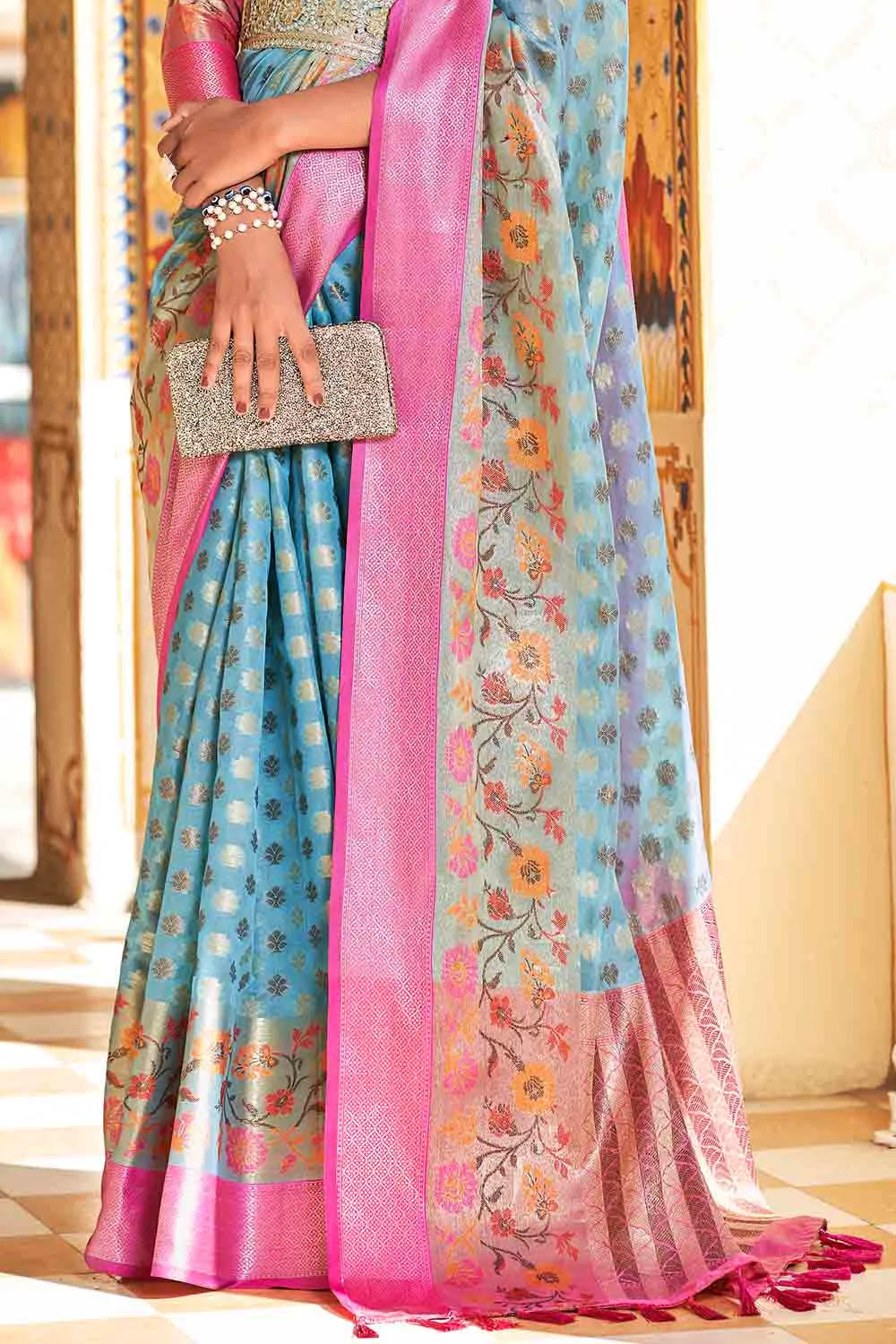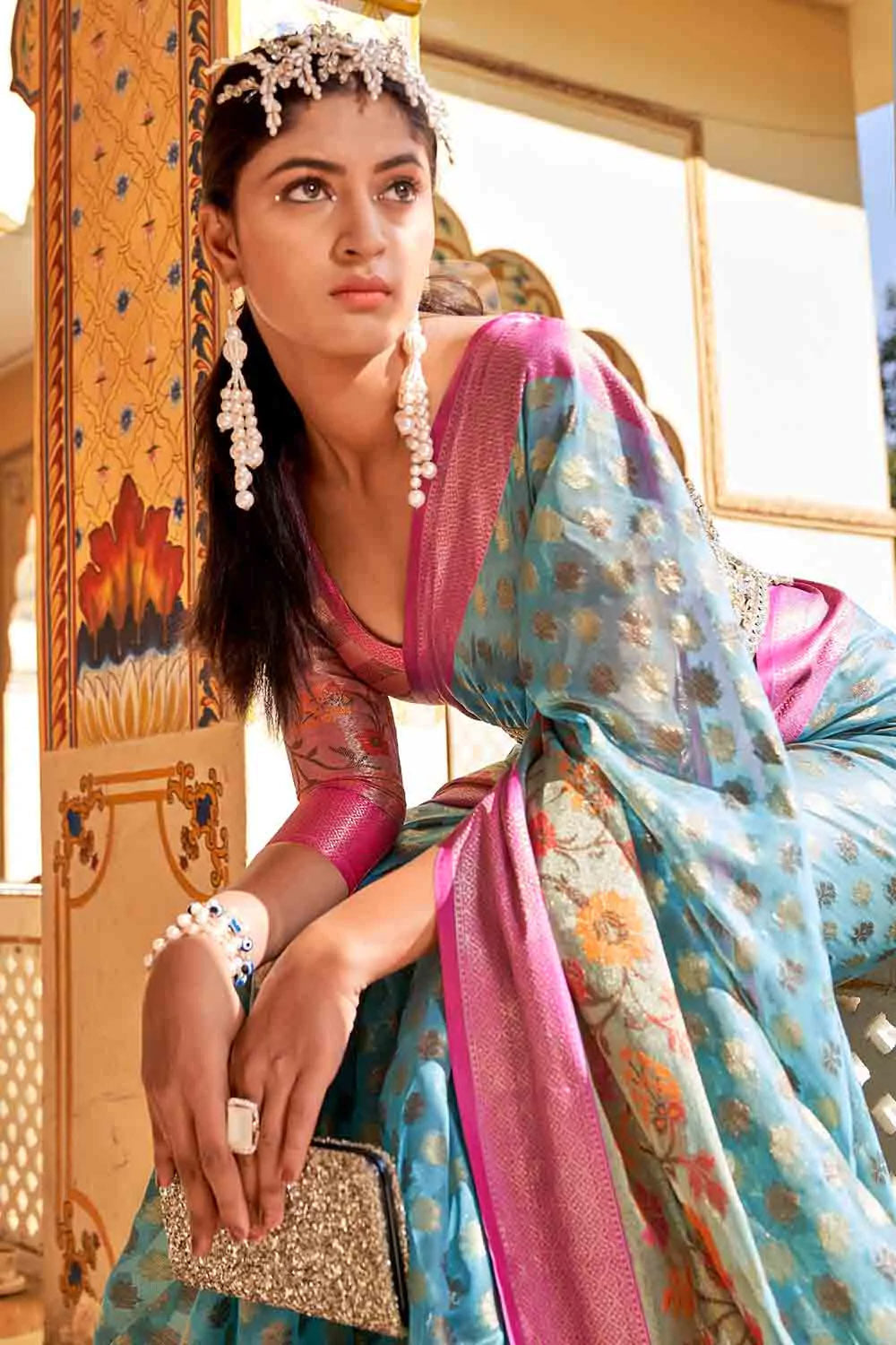 A royal pick for your best occasions, here comes our Kanjivaram silk saree collection from South India. This sparkling piece comes in shades of blue. Known for its rich design and distinguished border, it speaks tales of the rich heritage and craftsmanship involved.