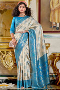 White And Blue Banarasi Silk Saree