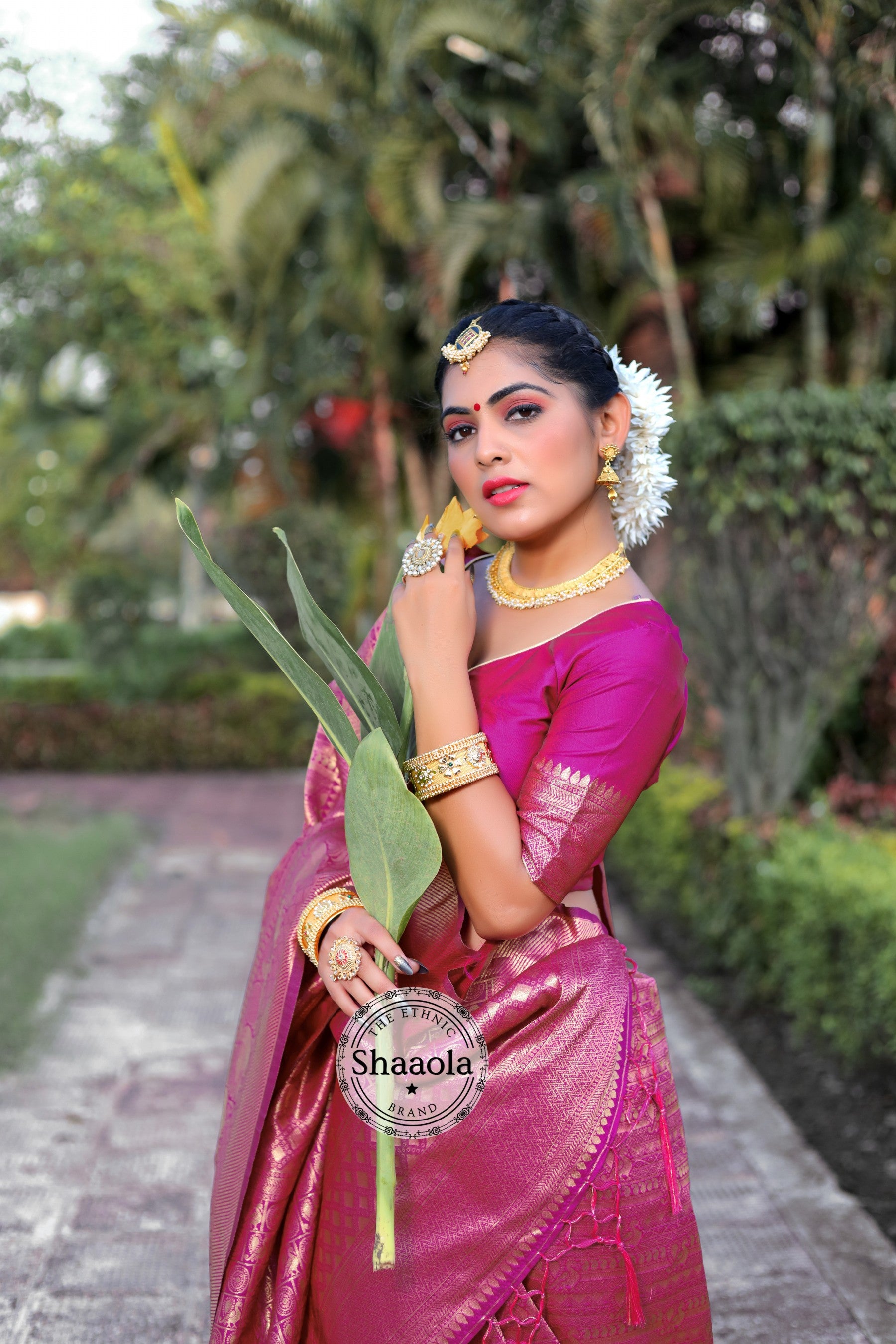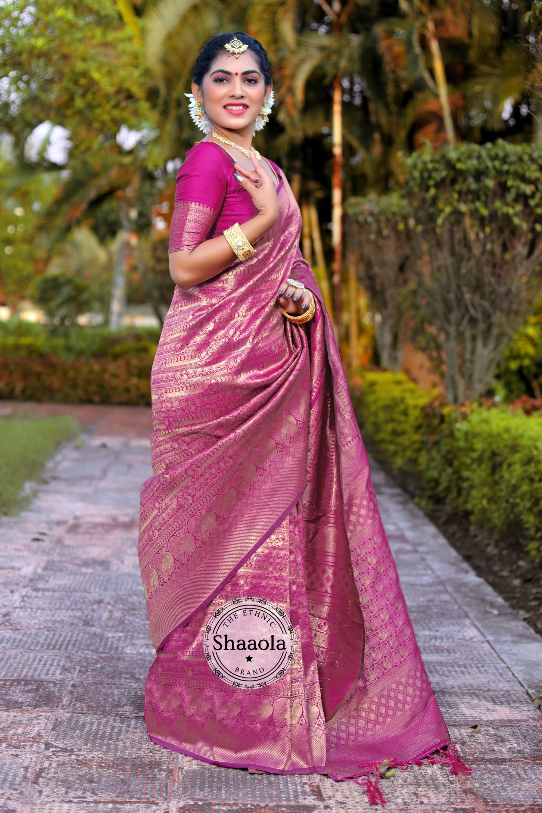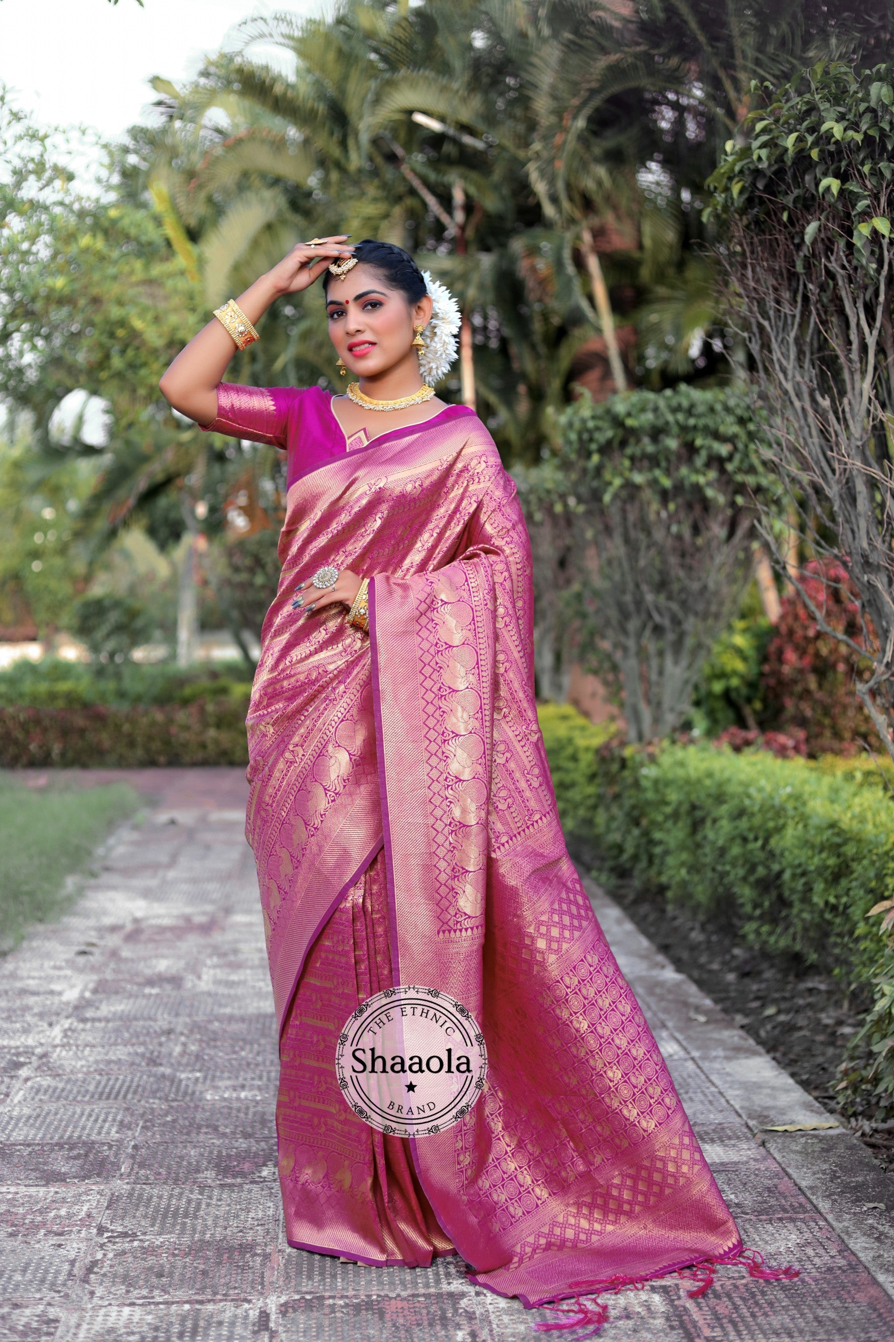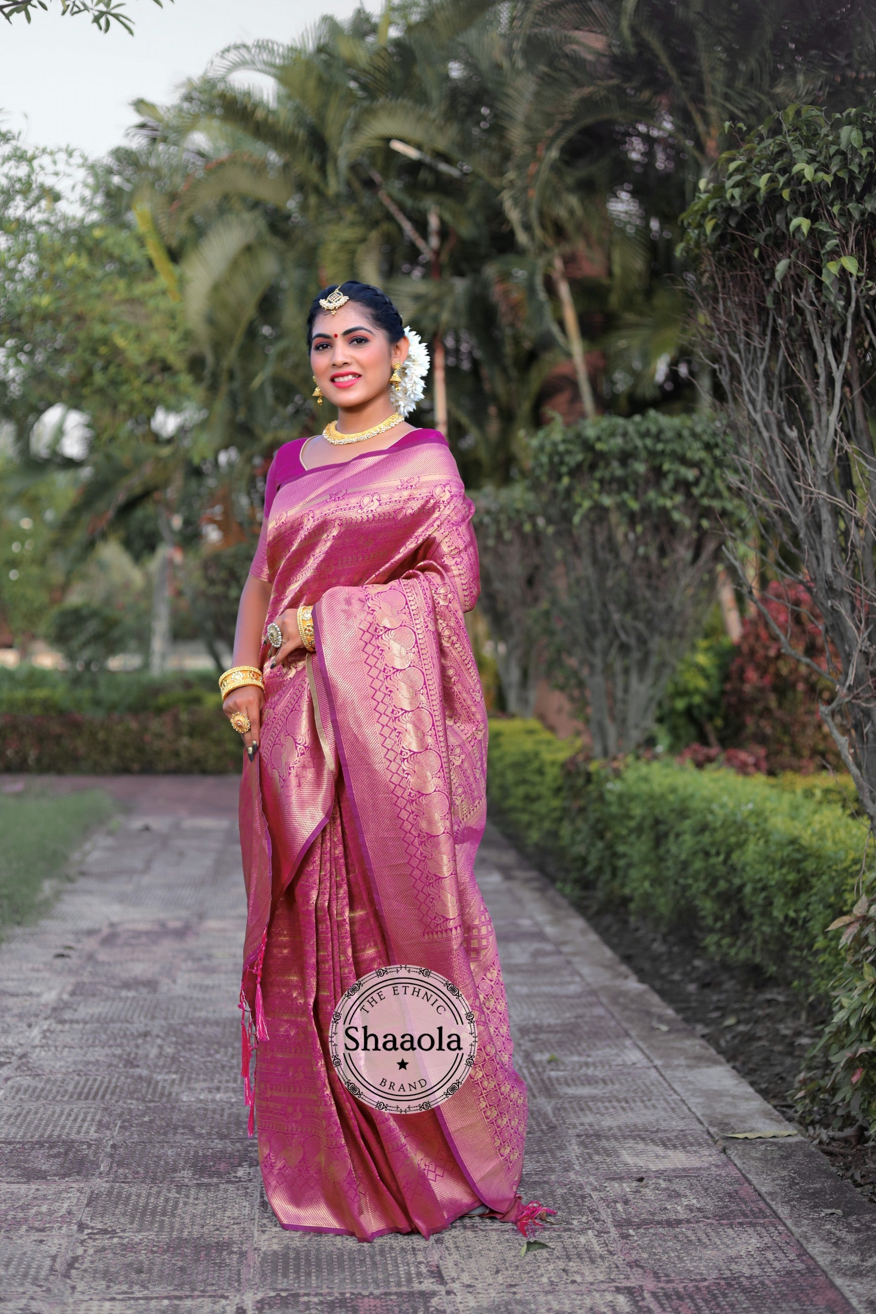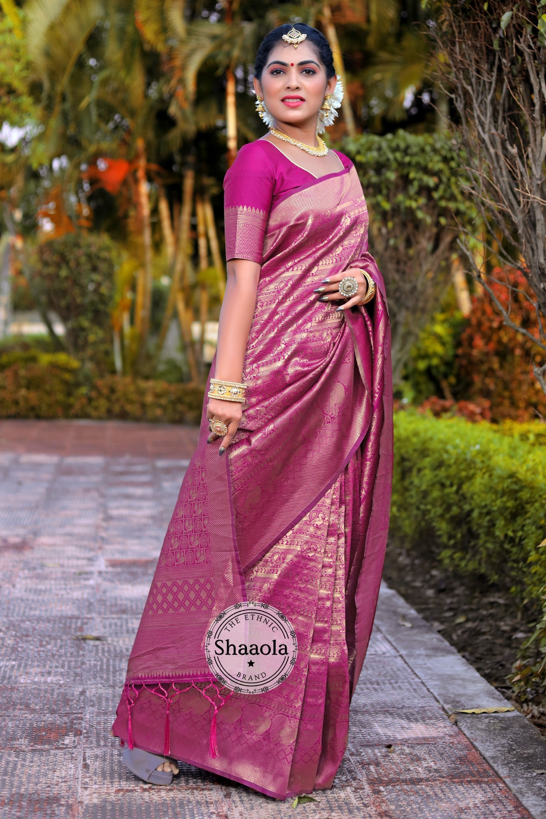 A royal pick for your best occasions, here comes our Kanjivaram silk saree collection from South India. This sparkling piece comes in shades of wine purple. Known for its rich design and distinguished border, it speaks tales of the rich heritage and craftsmanship involved.